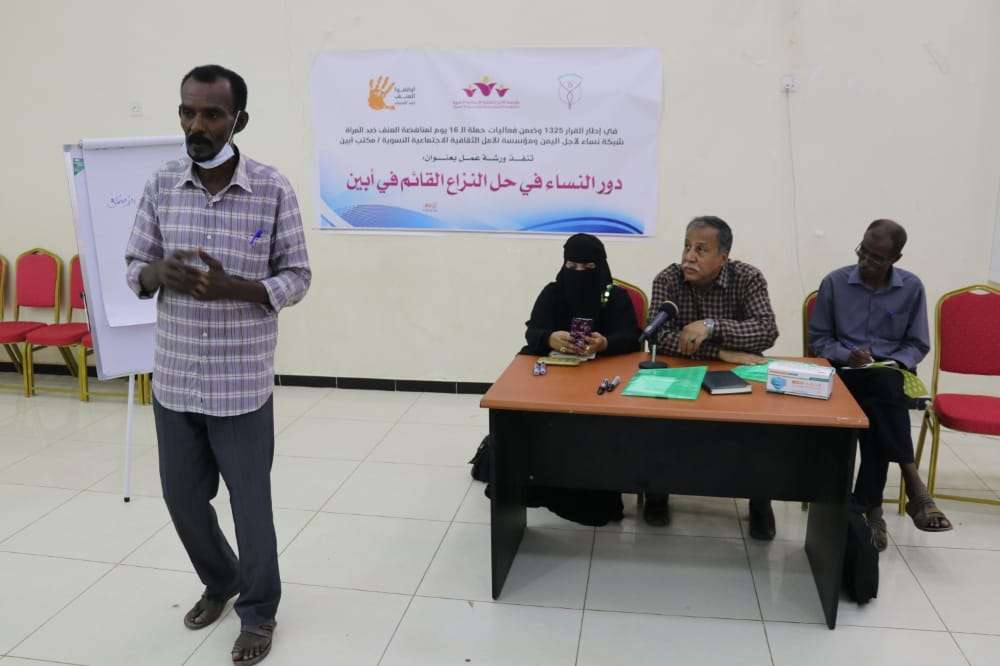 في إطار القرار الأممي ( 1325 ) وضمن فعاليات حملة الـ( 16 ) يوماً الدولية لمناهضة العنف ضد المرأة .. نفَّذت صباح اليوم الخميس بقاعة " رهف " للمؤتمرات بزنجبار شبكة نساء لأجل اليمن ومؤسسة الأمل الثقافية الإجتماعية النسوية ورشة عمل تحت عنوان " دور النساء في حل النزاع القائم في أبين " بمشاركة ( 40 ) إمرأة من مختلف الأعمار يمثلن قيادات نسوية وتربوية وإجتماعية في إطار المجتمع ومؤسساته المدنية بمديريتي زنجبار وخنفر ..