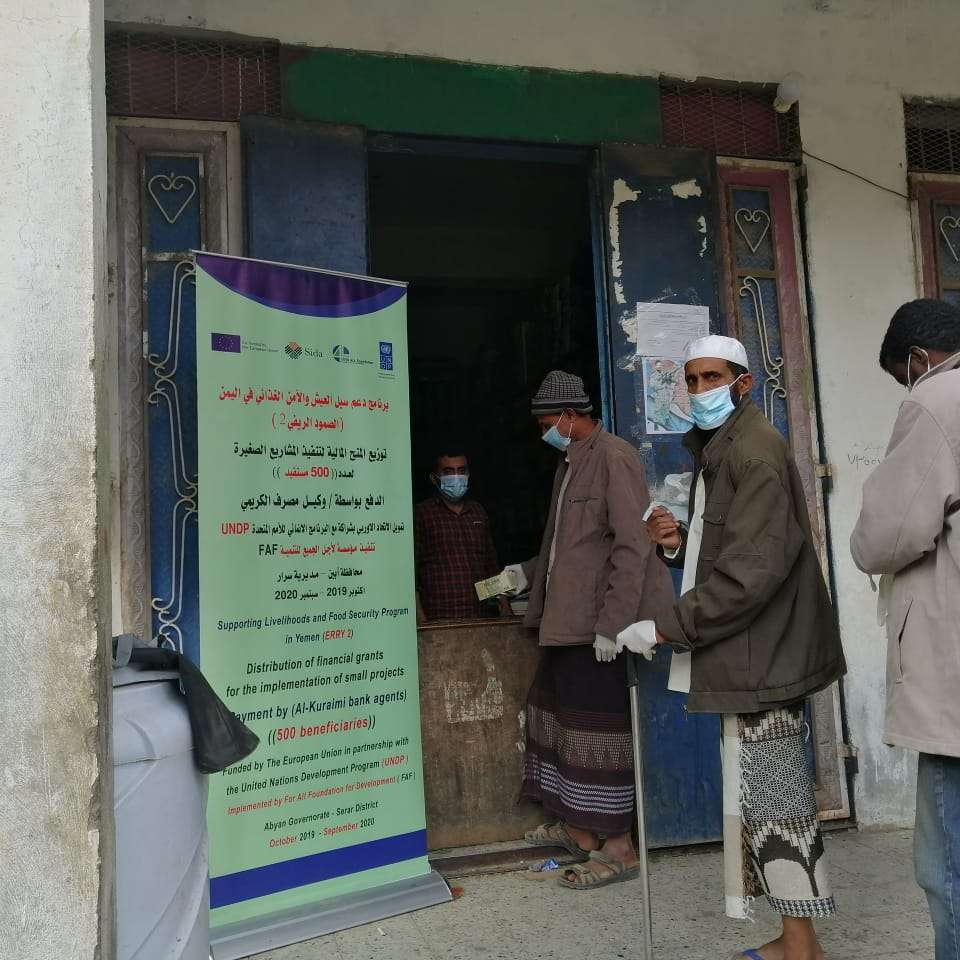 دُشنت،يوم أمس،في مديرية سرار يافع محافظة أبين،عملية صرف المنح المالية للحالات المستفيدية بالمديرية لتنفيذ المشاريع الصغيرة وذلك ضمن برنامج سُبل العيش والأمن الغذائي (الصمود الريفي2) الممول من الاتحاد الأوربي بالشراكة مع البرنامج الإنمائي للأمم المتحدة UNDP الذي تنفذه مؤسسة لأجل الجميع للتنمية.