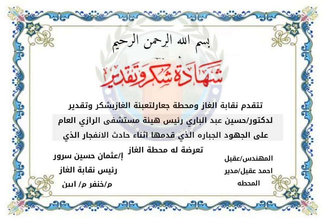لتلك الجهود التي بذلت من قبل رئيس هيئة مستشفى الرازي العام أبين الدكتور حسين عبدالباري السقاف في تفاعله وتسخير كافة الإمكانيات أثناء تعرض المحطة للانفجار في 12سبتمبر 2020م حيث كان للطاقم الطبي وإدارة المستشفي دور لايستهان به في إنقاذ الجرحى بالعلاج وتسخير كافة سيارات الإسعاف في نقل المصابين لمستشفيات عدن وإسعاف من تبقى بالعلاج داخل المستشفى والإهتمام والرعاية الطبية و الشخصية التي تمت من قبل شخص رئيس الهيئة لمستشفى الرازي أبين متمنيين لإدارة وهيئة مستشفى الرازي العام أبين وكادره الطبي والتمريضي كل التوفيق والنجاح