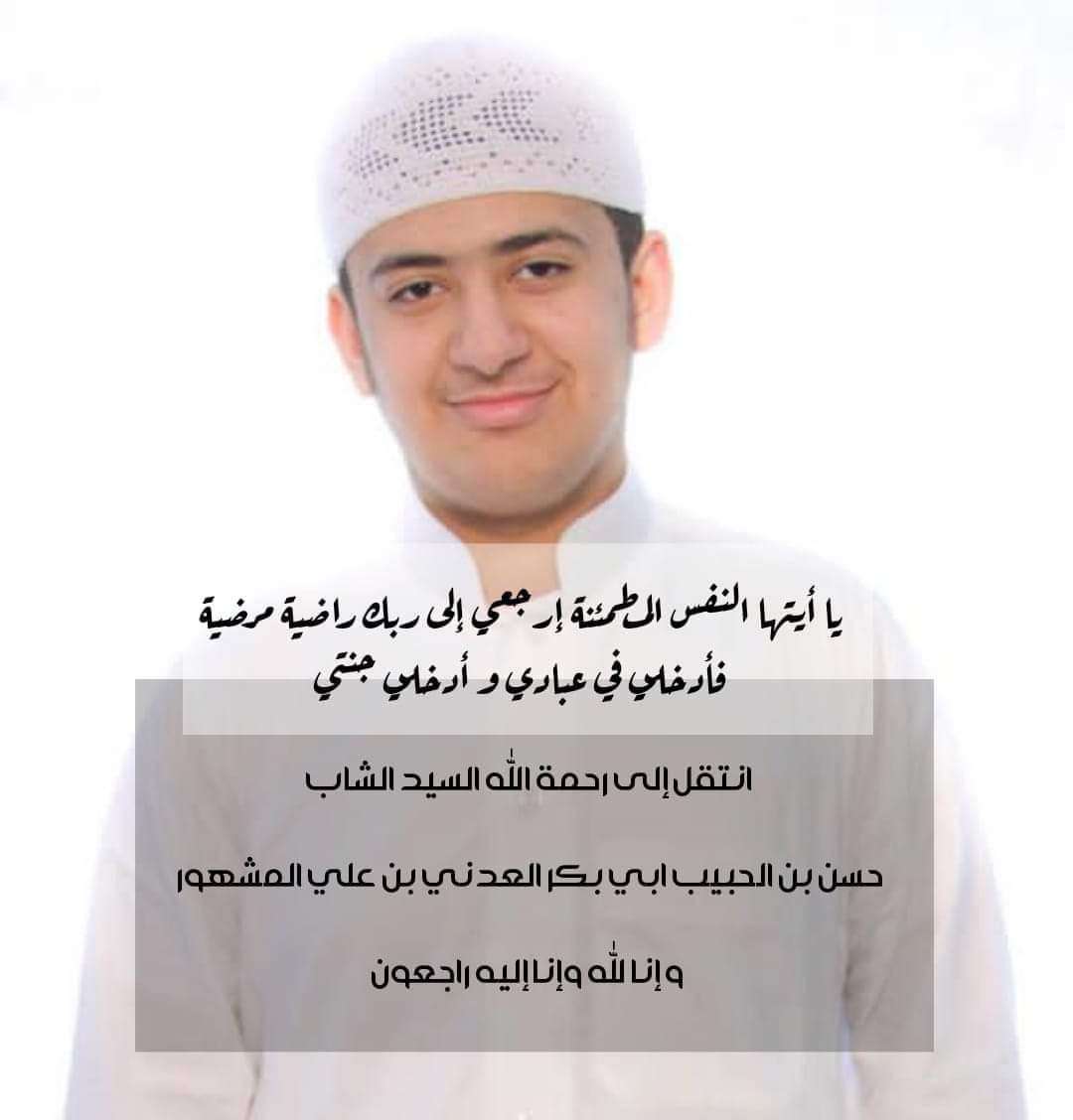 نرفع أحر تعازينا للمفكر والداعية الإمام الحبيب أبوبكر بن علي المشهور بوفاة نجله الأصغر (حسن) ولإخوة الفقيد وأحبائه ولكافة حبايبنا آل المشهور سائلين المولى الكريم أن يتغشاه بواسع رحمته وعظيم مغفرته ورضوانه وأن يسكنه الفردوس الأعلى مع النبيين والصديقين والشهداء والصالحين.