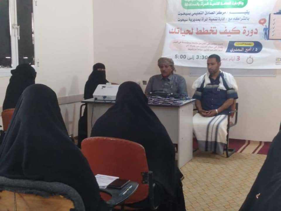 دشن رئيس لجنة الشؤون الاجتماعية بالمجلس المحلي بمديرية سيحوت الشيخ سعد عبدالله عفرار ، مساء الأحد ، دورة كيف تخطط لحياتك والتي أستهدفت ( 48 ) متدرب و متدربة خلال فترة ثلاثة أيام، والتي يقيمها مركز الصادق التعليمي بإشراف السلطة المحلية بمديرية سيحوت ، وشراكة إدارة تنمية المرأة بالمديرية ، وذلك بتكليف من القائم بأعمال مدير عام سيحوت الشيخ محمد أحمد سعيد الزويدي.