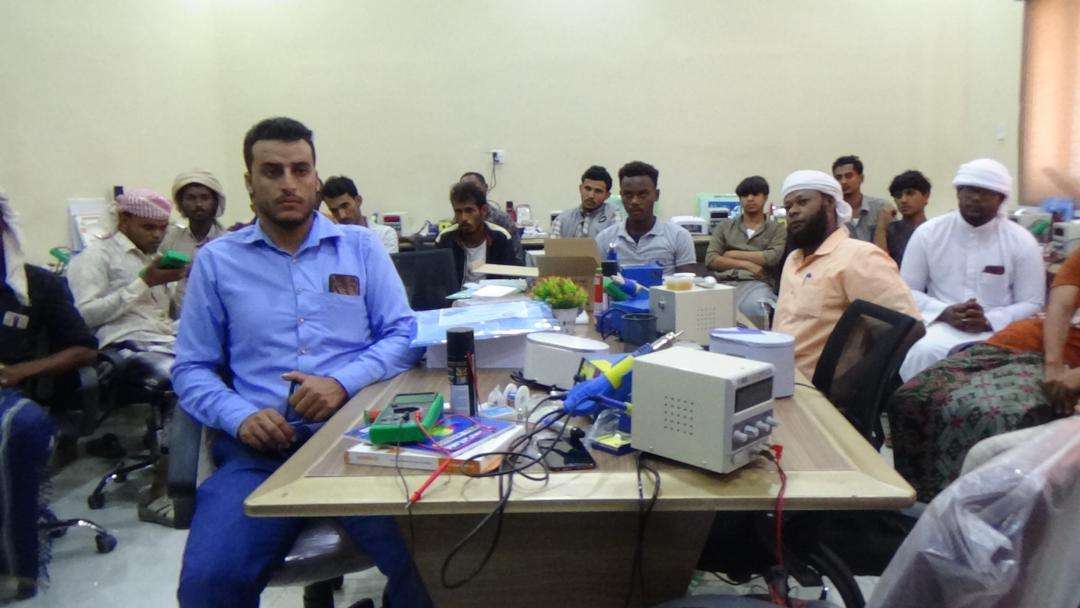 الدورة التدريبية الممولة من شركة النفط ضمن مساهماتها في دعم التنمية البشرية أقيمت على القاعة الكبرى في مقر المؤسسة و يشارك فيها 25 شابا من مختلف مديريات محافظة المهرة وتستمر 15 يوما تعد الأولى في مجال تأهيل الشباب في مجال الالكترونيات.