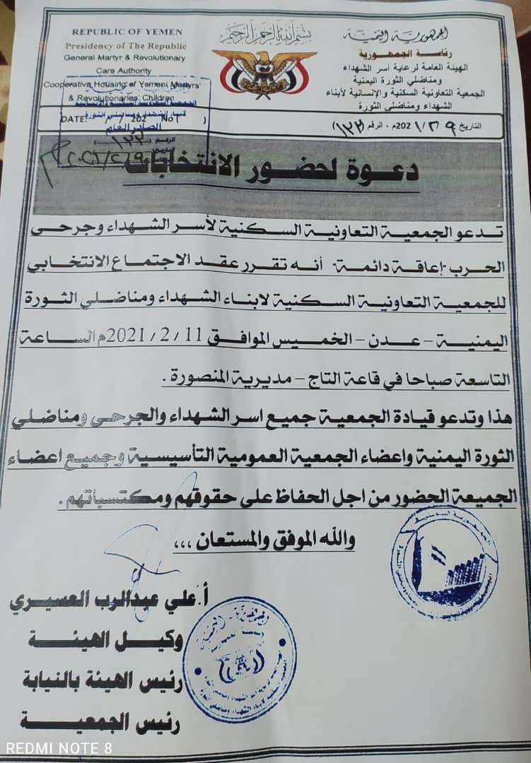 هذا و تدعو قيادة الجمعية جميع أسر الشهداء و الجرحى و مناضلي الثورة اليمنية و أعضاء الجمعية العمومية التأسيسية وجميع أعضاء. الجمعية الحضور من أجل الحفاظ على حقوقهم و مكتسباتهم وأراضيهم .