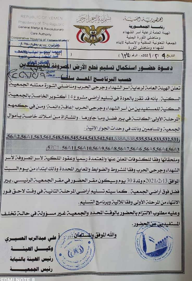 تعلن الهيئة العامة لرعاية أسر الشهداء و جرحى الحرب و مناضلي تسليم أراضي مشروع 14 اكتوبر الخاصة بالجمعية السكنية ومن في حكمهم المرحلة الأولى "الكائنة في بير فضل و ما جاورها" و المشتراة من أملاك خاصة بأموال الجمعية و المساهمين و ذلك في وحدات الجوار الآتية: