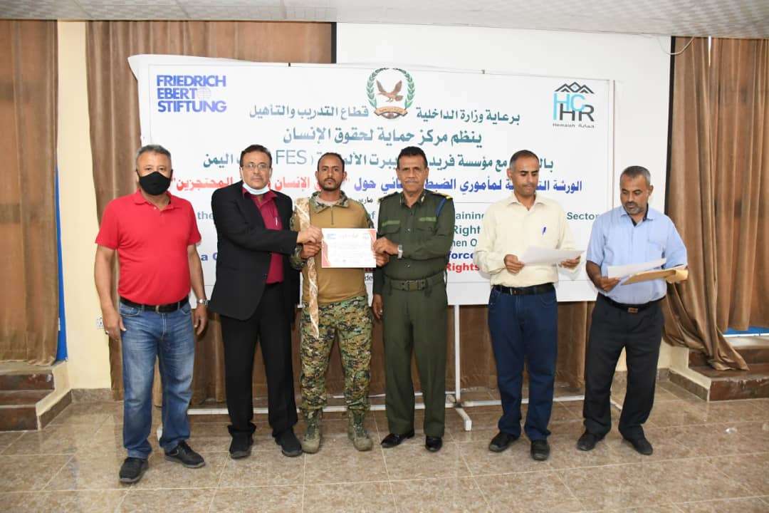 اختتمت اليوم الاثنين 8 مارس في فندق كورال بعدن الورشة التدريبية الثانية لمأموري الضبط القضائي في محافظة الضالع والتي يعقدها مركز حماية لحقوق الإنسان بالشراكة مع مؤسسة فريدريش ايبرت الألمانية، والتي استمرت ثلاثة أيام وتلقى المشاركين تدريبا حول حقوق الإنسان وحقوق المحتجزين. وفي ختام الورشة التي افتتحها محافظ محافظة الضالع العميد الركن علي مقبل صالح، تمنى القائم بأعمال الممثل غير المقيم لمؤسسة فريدريش ايبرت الاستاذ محمود قياح أن " الهدف من الورشة اطلاع المشاركين على حقوق المحتجزين وحقوق الانسان وتقليل حالات قيد الحرية وعدم انتهاك حقوق الانسان. نامل من المشاركة تطبيق المعارف على الارض من خلال تعاملاتهم اليومية في انفاذ القانون ونقل ماتعلموه لزملائهم في الميدان" كما أضاف " نشكركم على التزامكم وتفانيكم خلال ايام الدورة" وكان مدرب الورشة الدكتور عبدالسلام علي صالح الضالعي قد زود المشاركين بمادة قانونية مصحوبة بتجارب عملية وواقعية لكيفية التعامل مع قضايا المحتجزين، ووسائل احترام حقوق الإنسان، كما استعرض معهم واقع السجون في البلاد بالإضافة إلى أهم الاتفاقيات الدولية في هذا المجال وصولا إلى قواعد "نيلسون مانديلا " لمعاملة السجناء. وبدوره شكر رئيس مركز حماية لحقوق الانسان، ومؤسسة فريدريش ايبرت على قبولها الدعم الذي يحدث لأول مرة لبرامج تدريب لمأموري الضبط القضائي في محافظة الضالع كما أشاد بالمشاركين وتفاعلهم المتميز خلال أيام التدريب.