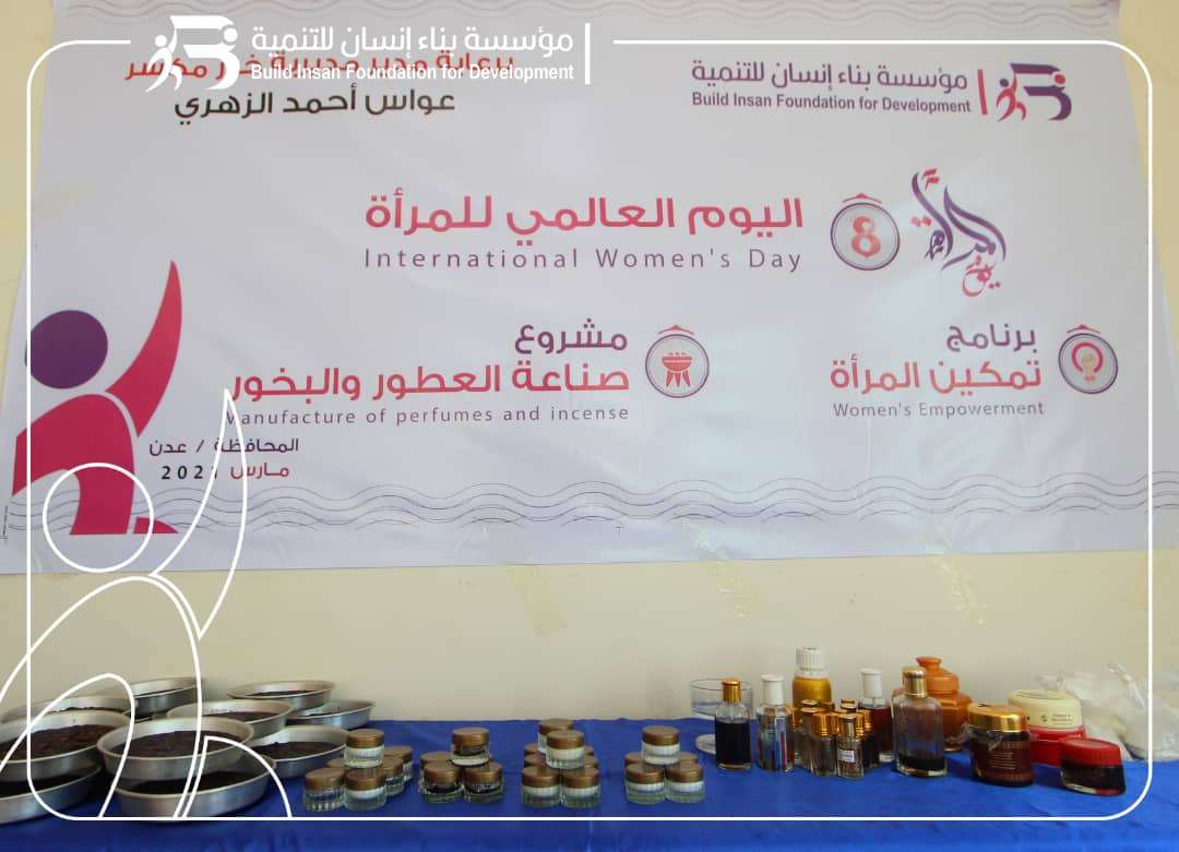 ومن جابها تحدثت رئيسة مؤسسة بناء إنسان للتنمية رويد عبده حزام عن مجالات عمل المؤسسة وهي تمكين المرأة وتنمية الأسرة وبناء قدرات الطفل، مشيراً ان المؤسسة اختارت هذا اليوم "يوم المرأة العالمي" لتحتفل فيه وتقدم فيه مشروع صناعة البخور والعطور لتمكين المرأة من القيام بمشاريع صغيرة لتحسين سبل العيش.
