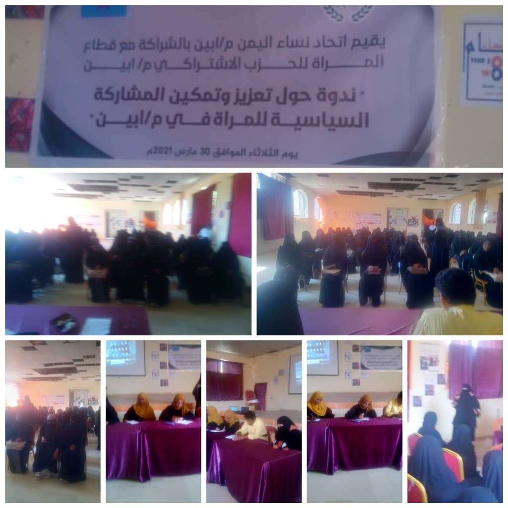 اقيم صباح اليوم بقاعة اتحاد نساء اليمن محافظة أبين ندوة سياسية تحت عنوان تعزيز وتمكين المشاركة السياسية للمرأة في محافظة أبين بالشراكة بين إتحاد نساء اليمن م / أبين وقطاع المرأة بالحزب الاشتراكي محافظة أبين