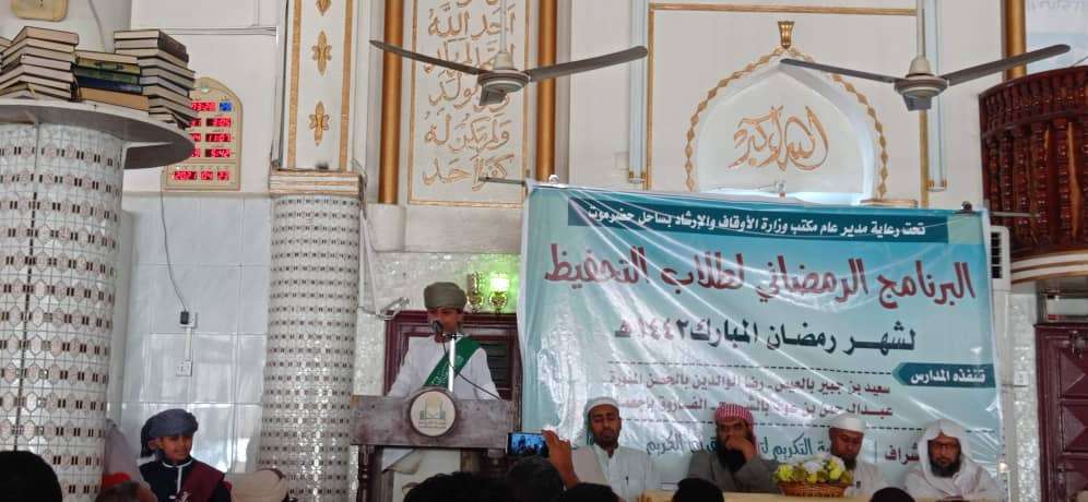 دشنت جمعية التكريم لتعليم القرآن الكريم بجامع الشهداء بمدينة المكلا البرنامج الرمضاني لطلاب تحفيظ القرآن الكريم برعاية كريمة من مكتب وزارة الأوقاف والإرشاد بساحل حضرموت وفي حفل التدشين أشاد السيد / عبدالله شيخان الحبشي المدير العام لمكتب الأوقاف والإرشاد بمديرية المكلا بالبرامج والأنشطة التي تنفذها جمعية التكريم ورعايتها لحفاظ كتاب الله وخدمة القرآن الكريم مثمنا جهود إدارة الجمعية في إنجاح كافة الاعمال والأنشطة المتنوعة التي تنفذها جمعية التكريم ضمن أعمالها السنوية في المجال الديني والتوعوي والإرشادي .