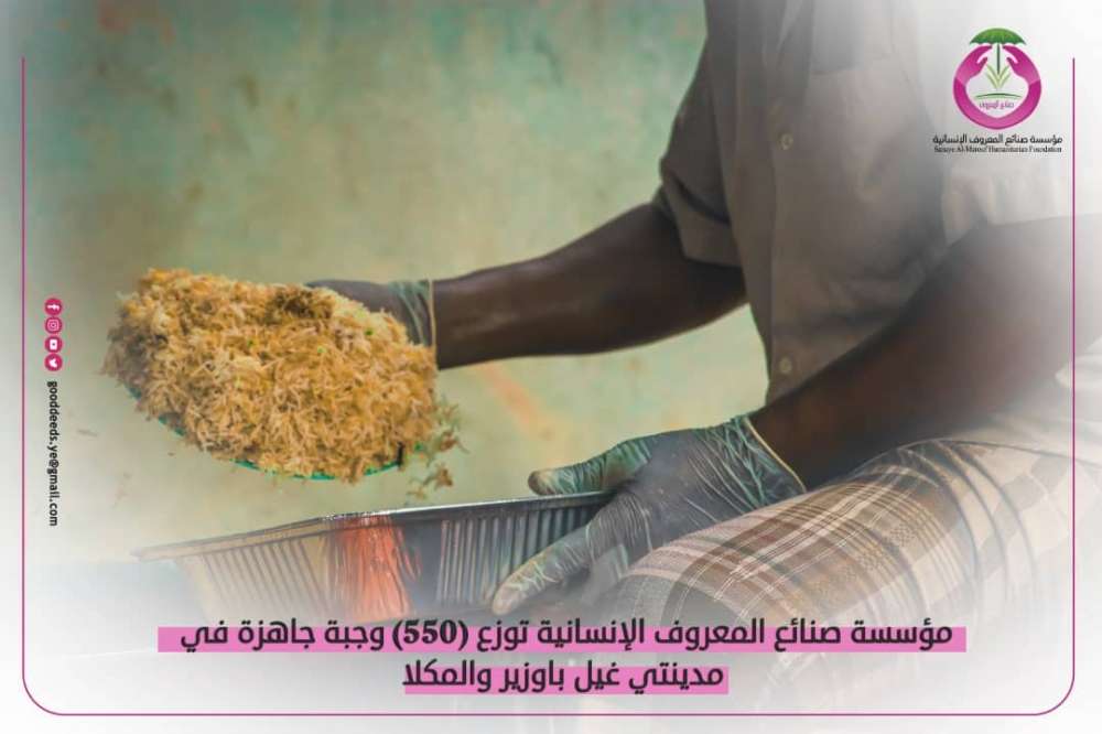ضمن مشروع إفطار الصائم الخيري، قدمت مؤسسة صنائع المعروف الإنسانية بحضرموت(550) وجبة غذائية لسكان المناطق الفقيرة بمدينتي غيل باوزير.