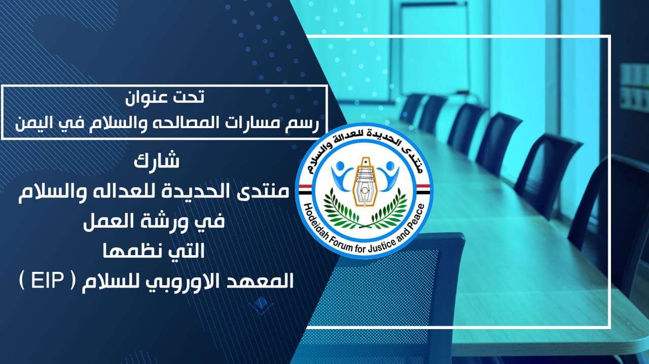 تحت عنوان " رسم مسارات السلام والمصالحة في اليمن بناءً على احتياجات حقوق الإنسان" شارك منتدى الحديدة للعادلة والسلام في اللقاء الموسع الخاصة بمحافظة الحديدة، وورشة العمل التي نظمها المعهد الأوروبي للسلام (EIP)، على منصة زوم الخميس الموافق 20/مايو/2021.