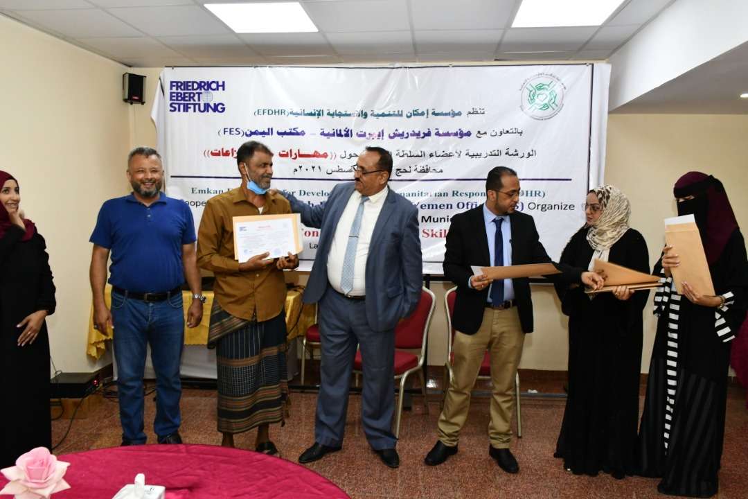 وفي ختام هذه الدورة التدريبية قام الأستاذ عوض بن عوض الصلاحي نائب محافظ محافظة لحج- أمين عام المجلس المحلي، والأستاذ محمود قياح الممثل الغير مقيم لمؤسسة فريدريش ايبرت الألمانية ومدير برامجها، والأستاذ مازن محمد صالح رئيس مؤسسة إمكان، بتوزيع الشهادات على الأعضاء المشاركين.