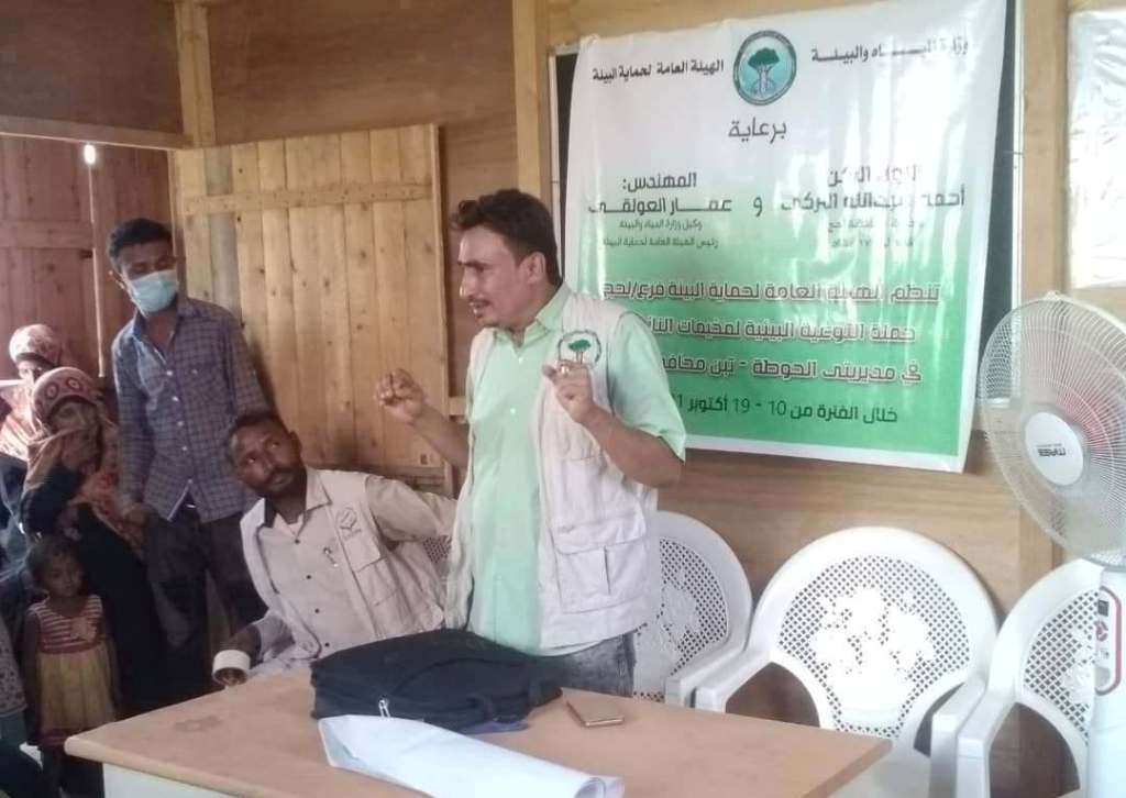 ونوه الأخ رئيس قسم التوعية والإعلام بالهيئة العامة لحماية البيئة بلحج أن هذه الحملة تستهدف مخيمات النازحين في مديريتي الحوطة وتبن وتتضمن التوعية في عددٍ من المحاور منها الاستفادة من المياه العادمة والاهتمام بعملية التشجير للقضاء على التصحر والحفاظ على النظافة العامة والشخصية، مختتماً حديثه بالشكر والتقدير للأستاذ /عمر الصماتي مستشار محافظة لحج لشؤون المنظمات ومدير الوحدة التنفيذية للنازحين على تفاعله وتجاوبه مع الهيئة في تسهيل تنفيذ هذه الحملة التي ستستمر 10 أيام وتستهدف مخيم النازحين المشقافة ومخيم النازحين العند ومخيم النازحين بيزج في مديرية الحوطة.