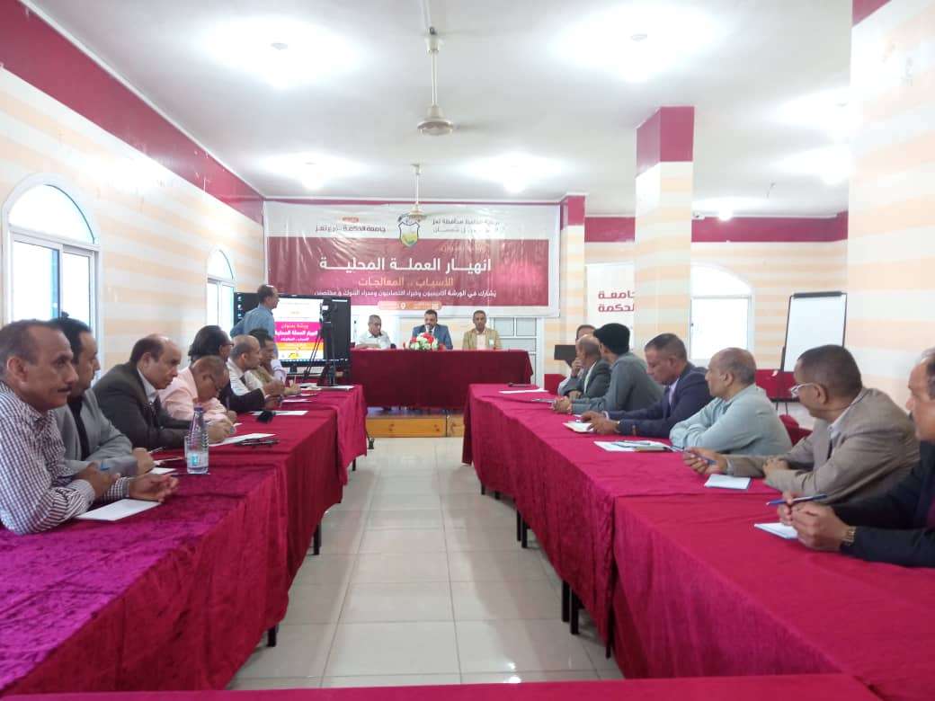 رئيس جامعة الحكمة "عبده محمد الكليبي" ، أكد أن مثل هذه الورش، ستعمل على تدارس اسباب انهيار العملة واقتراح اليات وطرق للحد من ذلك والتقدم بها للسلطة المحلية في المحافظة ومنها الى الحكومة الشرعية ممثلة برئيس وزرائها الدكتور معين عبدالملك .