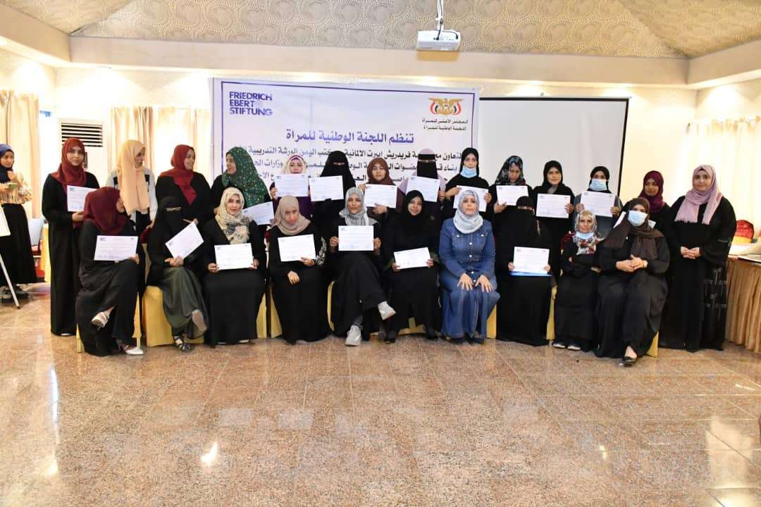 اختتمت اليوم في العاصمة الموقتة عدن الورشة التدريبية الأولى في بناء قدرات عضوات اللجنة الوطنية للمرأة في الوزارات الحكومية حول حملة المناصرة ضد العنف القائم على النوع الاجتماعي والذي نظمته اللجنة الوطنية للمرأة بالتعاون مع مؤسسة فيردريش ايبرت الالمانية بمشاركة مدراء عموم المرأة في الوزارات الحكومية والتي استمرت على مدى ثلاثة أيام ناقشت فيها العديد من الأوراق المتعلقة بالمفاهيم الخاصة بحقوق الانسان والنوع الاجتماعي وأسباب وأشكال العنف والتمييز القائم على النوع الاجتماعي وآثاره وكذا التحديات الراهنة أمام اللجنة الوطنية للمرأة وادارات المرأة في الوزارات في تنفيذ حملات المناصرة لقضايا النوع الاجتماعي