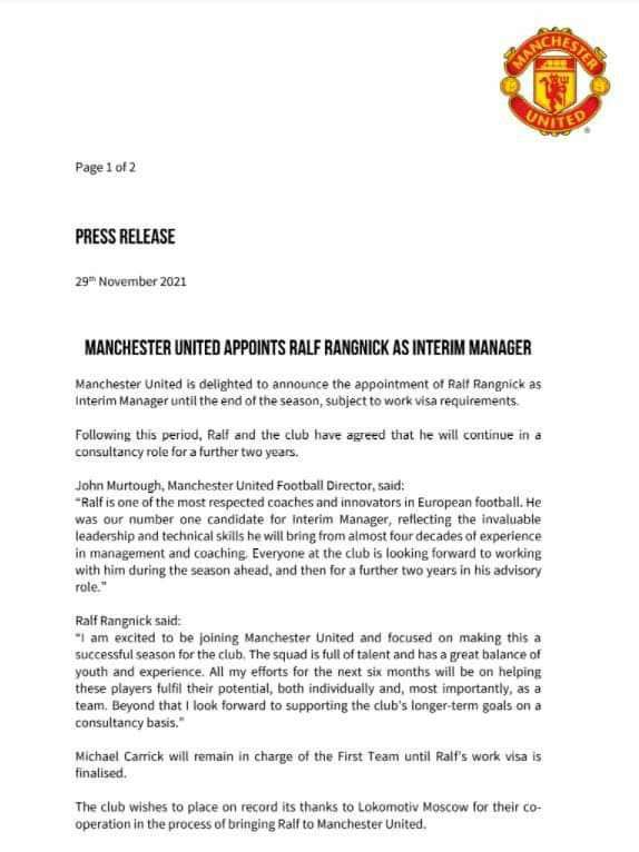 وقال يونايتد، في بيان رسمي "يسر النادي، الإعلان عن تعيين رانجنيك كمدرب مؤقت حتى نهاية الموسم، كما أنه سيستمر في دوره الاستشاري لمدة عامين آخرين".