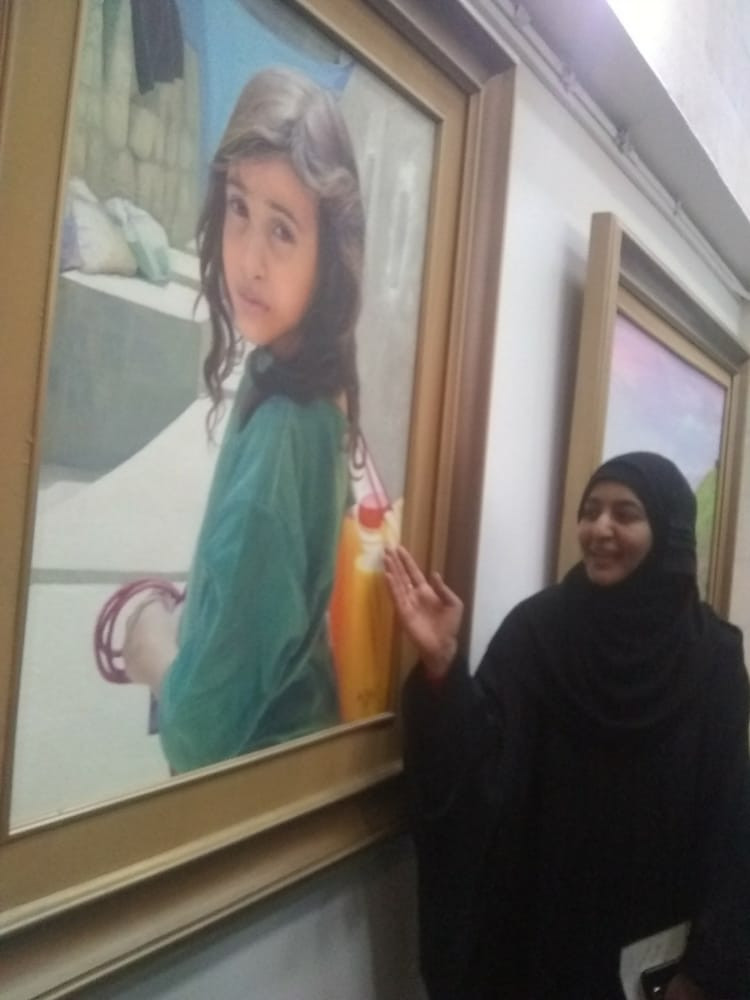 وفي اكمال جولتنا في اليوم للمعرض الذي يستمر حتى السادس من ديسمبر المقبل احتوى المعرض العديد من اللوحات القديمة واخرى حديثة تحمل معاناة اليمنين فيبدأ المعرض -من اليمين الى اليسار- اللوحة الأولى تظهر فيها طفلة متعبة نائمة تحمل في يدها زوهورا "نبتة عطرية يمنية" وخلفية بنايات مدمرة . .بينما الثانية لوحة زيتية توضح معاناة طفلة أخرى تحمل على ظهرها دبة ماء ما تعكس معاناة اليمنيين في زمن الحرب فيما حملت اللوحات الأخريات بشكل متفاوت مناظر من محافظات يمنية مختلفة إلى جانب الازياء الشعبية اليمنية للفتيات ..
