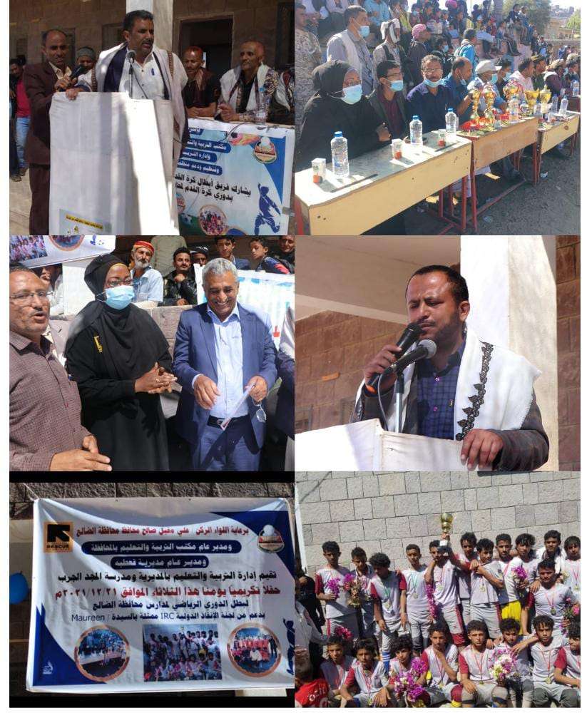 و مدير مديرية قعطبة العقيد أحمد ناجي المريسي تم تكريم بطل دوري كرة القدم لمحافظة الضالع وحضي باللقلب الفريق الرياضي بمدرسة المجد الذي كان ممثلا للفرق الرياضية بمدارس قعطبة المستهدفة من قبل منظمة إنقاذ الدولية ..
