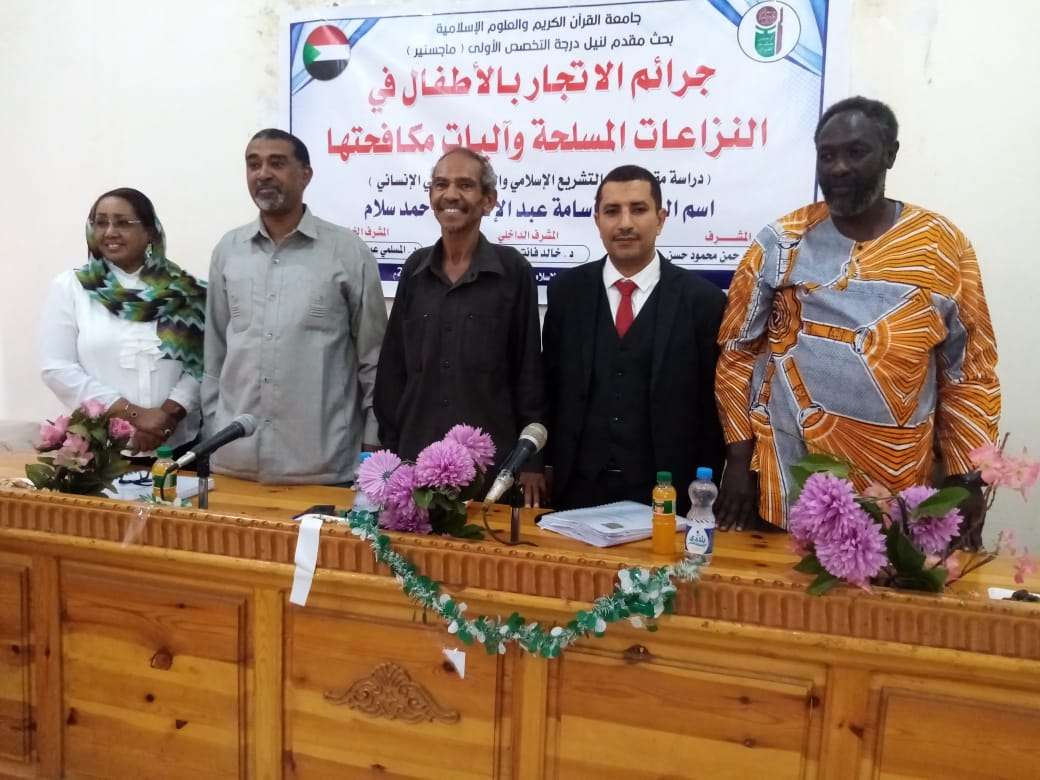 منح الباحث " المحامي والناشط الحقوقي " أسامة عبدالاله سلام الأصبحي رئيس شبكة محامون ضد الفساد رئيس مؤسسة العدالة للمحاماة والاستشارات والتدريب درجة الماجستير بإمتياز مع مرتبة الشرف مع التوصية بطباعة الرسالة من جمهورية السودان على رسالته الموسومة بـ( جرائم الإتجار بالأطفال في النزاعات المسلحة وأليات مكافحتها دراسة مقارنة في التشريع الإسلامي والقانون الدولي الإنساني ).