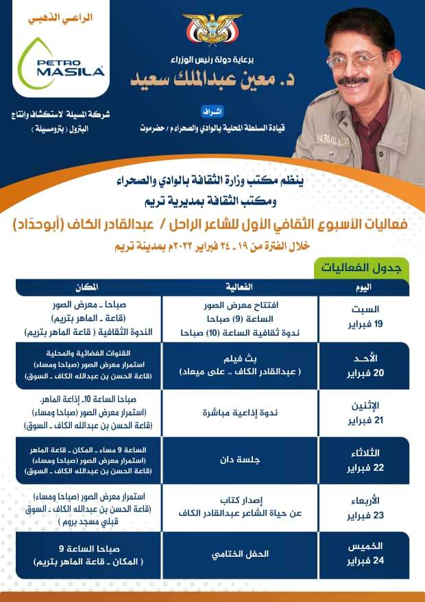 برعاية دولة رئيس الوزراء الدكتور معين عبدالملك سعيد وإشراف قيادة السلطة المحلية بوادي حضرموت والصحراء وبتمويل شركة المسيلة لاستكشاف وإنتاج البترول (بترومسيلة) تنطلق السبت القادم فعاليات الأسبوع الثقافي الأول للشاعر والملحن الفقيد عبد القادر محمد الكاف .