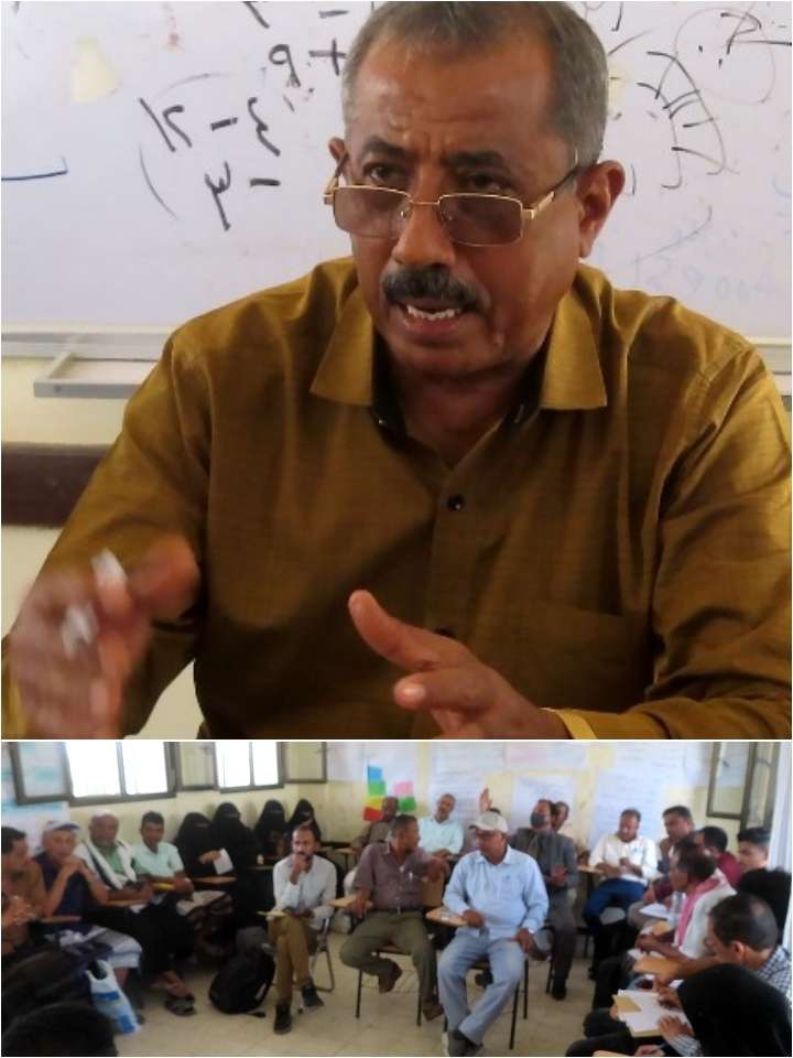 مشرف منظمة الصحة العالمية د. منتصر سالم العمودي ومدير الرعاية الصحية الأولية د. عمر فضل عمير ومدير التحصين بالمحافطة الاخ حسن فضل ومنسق برنامج التغذية كمال جبران ورئيسة مؤسسة ثمار للتنمية الاخت خلود القديري ومدراء مكاتب الصحة ومشرفي التحصين ومسؤولي الإمداد في المديريات لتقييم أعمال حملة شلل الأطفال في جولتها الأولى والتحضير لتهيئة وتنفيذ الجولة الثانية من حملة شلل الاطفال دون سن العاشرة في جميع مديريات المحافظة..
