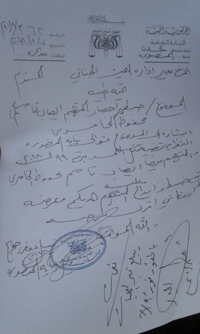 وكان مدير إدارة البحث الجنائي بعدن العميد محمد القملي قد وجه مذكرة سابقة لشرطة عدن بضبط واحضار المتهم.