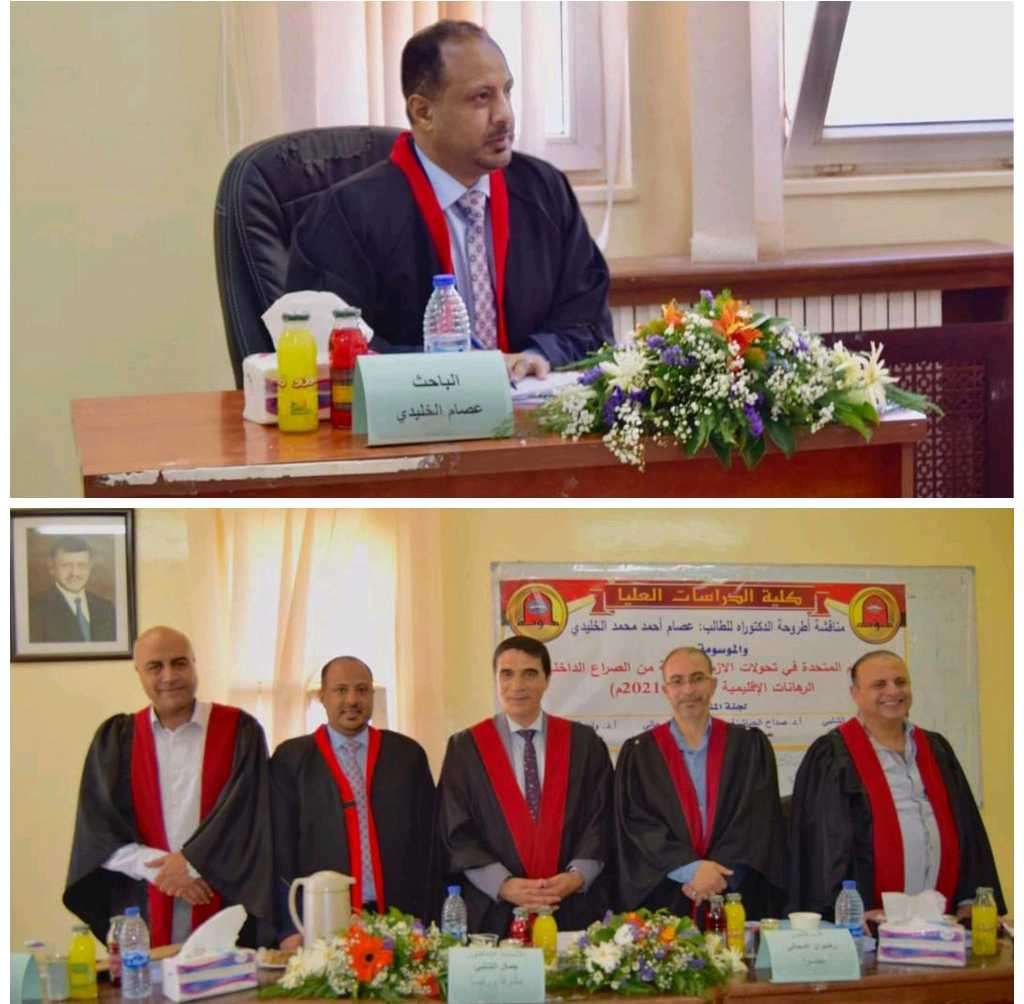 وناقش الخليدي رسالته الموسومة بدور الأمم المتحدة في تحولات الأزمة اليمنية من الصراع الداخلي إلى الرهانات الإقليمية من 2011م إلى 2021م.
