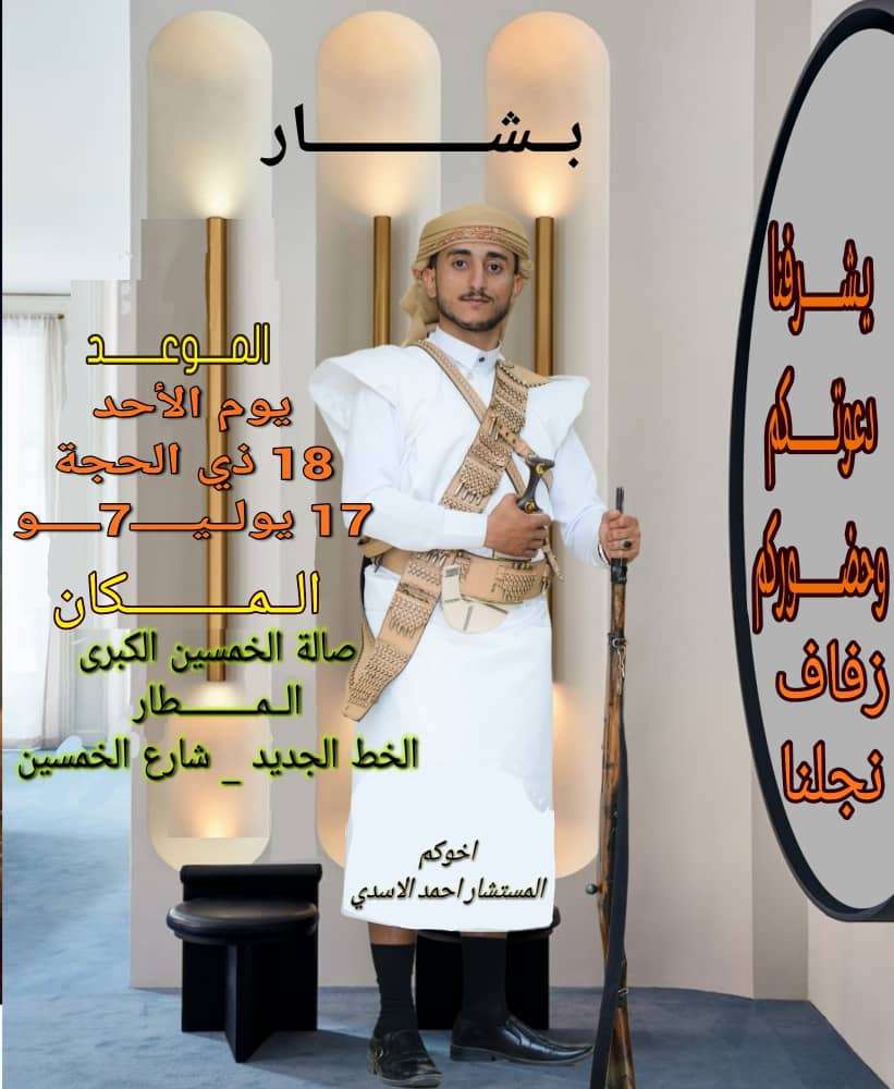 ويحيي حفل زفاف الشاب بشار أحمد الأسدي ، الذي يدشنه فنان اليمن الكبير أيوب طارش بالنشيد الوطني ، عدد من الفنانين والمنشدين والمزوملين المعروفين ، برفقة فرقهم المتألقة، من خلال تقديم باقة من أجمل الأغاني والأناشيد المطربة للقلوب والأسماع ..