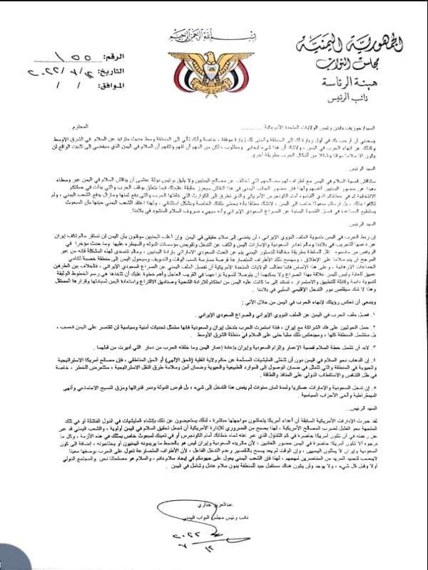 ستناقش قضية السلام في اليمن مع أطراف لهم مصالحهم التي تختلف عن مصالح اليمنيين ولا يليق برئيس دولة عظمى أن يناقش السلام في اليمن عبر وسطاء بعيدا عن حضور اليمنيين أنفسهم ولهذا فإن حضور الجانب اليمني في هذا النقاش سيعزز حقيقة عقيدتك فيما يتعلق بوقف الحرب والتي بدأت في حملتكم الانتخابية ثم في خطابكم الذي ألقيتموه أمام الكونجرس الأمريكي والذي تطرق إلى الكوارث التي خلفتها الحرب والتي دفع ثمنها ومازال يدفع الشعب اليمني ، ولم تكتفوا بذلك ، بل أرسلتم مبعوثا خاصا إلى اليمن ، لانشك مطلقا بأنه يحظى بثقتك الخاصة وبشكل استثنائي ، ولهذا اعتقد الشعب اليمني حينها بأن المبعوث يستطيع المساعدة في فصل القضية اليمنية عن الصراع السعودي الإيراني وأنه سيهيء ضروف السلام المنشود في بلادنا..