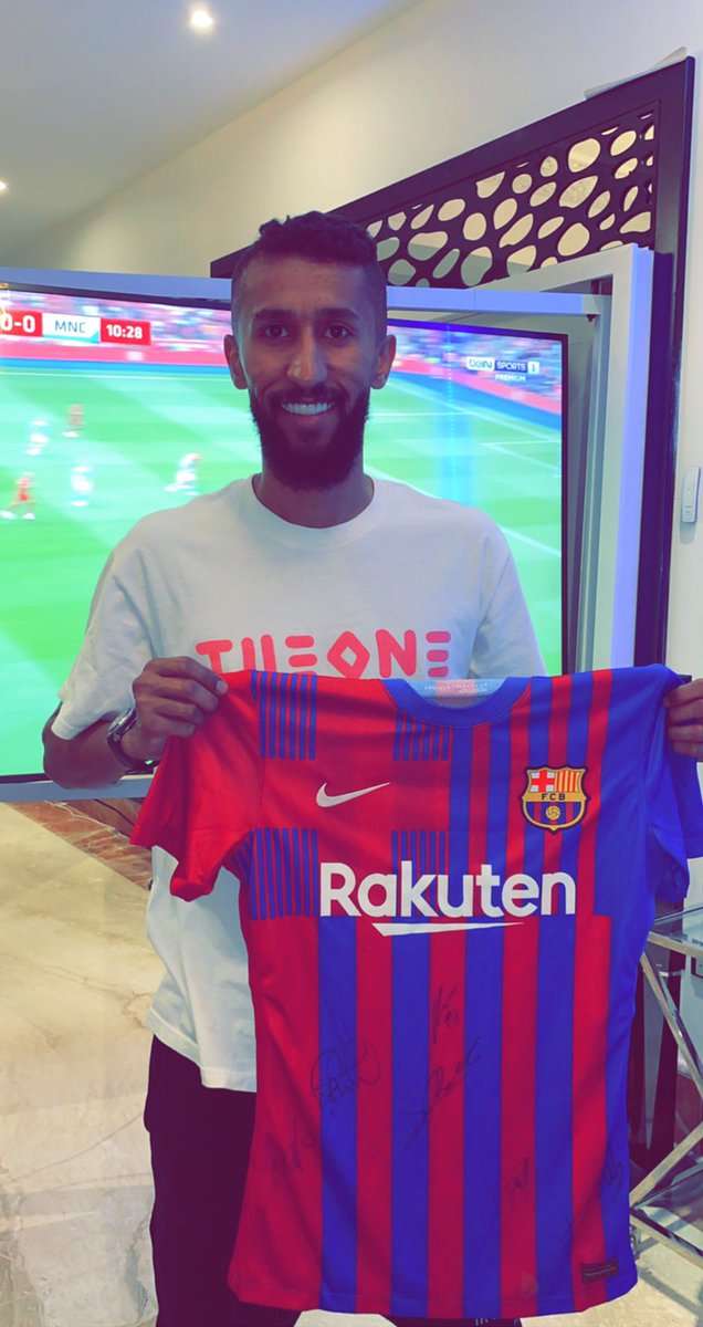 ونشر الفرج عبر حسابه الرسمي على موقع "تويتر" صورة له وهو يحمل قميص نادي برشلونة الإسباني، موضحا: "وصلني تيشيرت برشلونة موقعا من اللاعبين".
