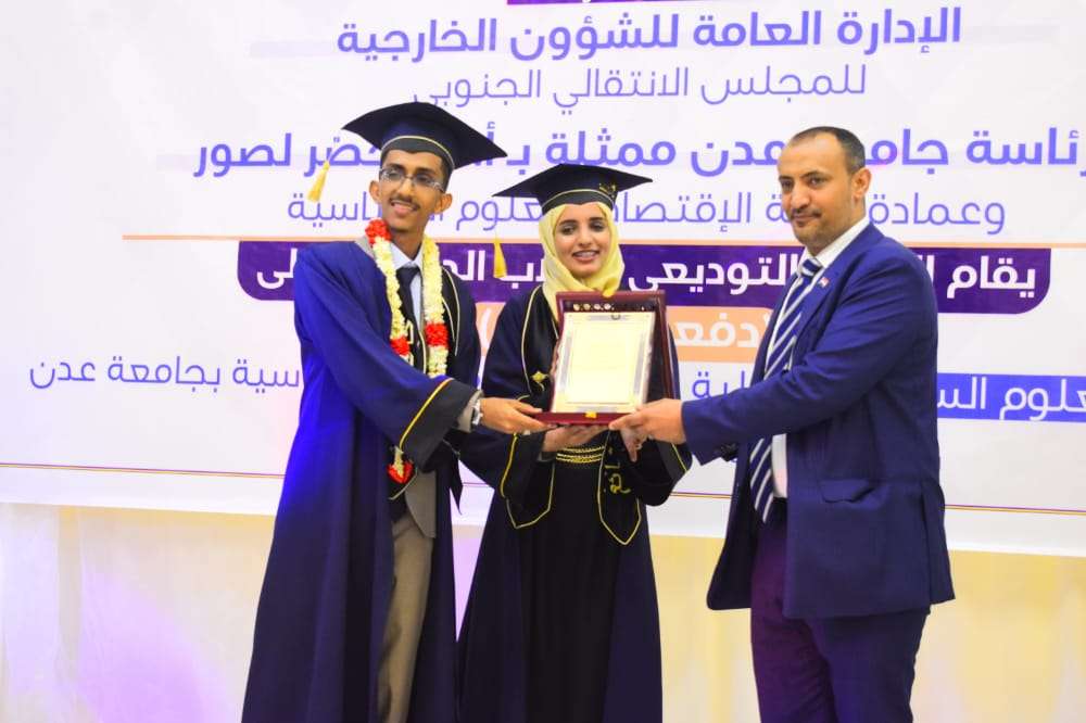 حضر حفل التخرج والذي أقيم بإشراف من الإدارة العامة للشؤون الخارجية للمجلس الانتقالي، الأستاذ انيس الشرفي نائب رئيس الإدارة العامة للشؤون الخارجية في المجلس، وعميد كلية الاقتصاد والعلوم السياسية الدكتور احمد مقبل، ورئيس المكتب السياسي للحراك الثوري الاستاذ فادي باعوم، وعدد من القيادات المدنية والعسكرية.