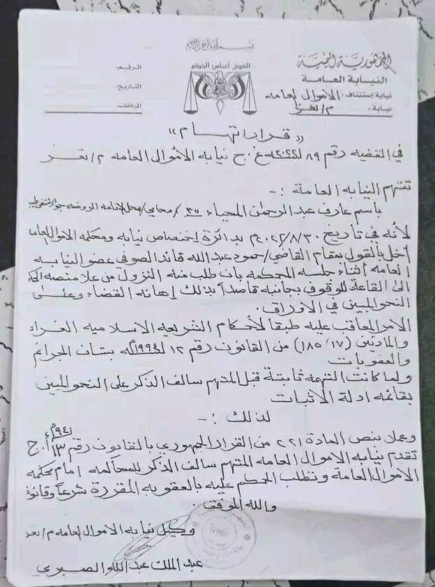 اصدرت النيابة العامة بتعز قرارا باحالة المحامي باسم عارف المحياء للمحاكمة بسبب اخلاله بمقام القاضي حمود عبدالله الصوفي خلال جلسة بدائرة اختصاص نيابة ومحكمة الاموال العامة.