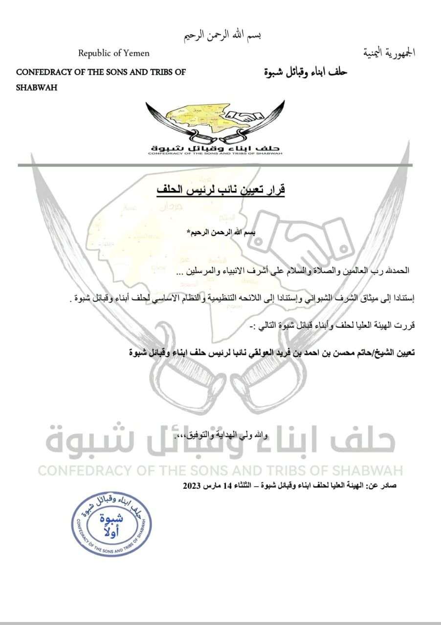 نتقدم باجمل وارق التهاني للشيخ حاتم محسن العولقي بتعيينه نائب لرئيس حلف قبائل ابناء شبوة.