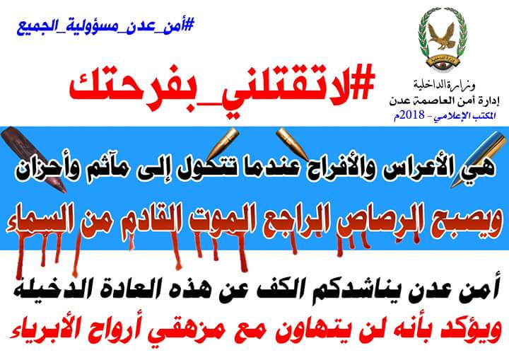 وأوضح العقيد/ نبيل عامر مدير شرطة التواهي" أن رجال الأمن تحركوا فور إطلاق كثيف للأعيرة النارية بموكب زفاف (عريس) من المعلا إلى منزله بالتواهي، وتم إلقاء القبض على أحد مطلقي الأعيرة النارية وايداعه السجن، وإعطاء مهلة للعريس للحضور إلى المركز الساعة العاشرة صباح اليوم الثلاثاء .