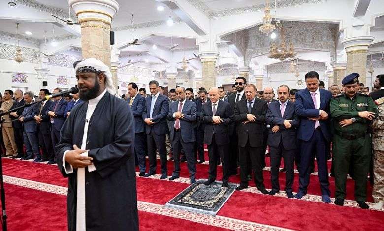 وشهد رئيس مجلس القيادة الرئاسي، خطبتي العيد بحضور رئيس مجلس الوزراء سالم صالح بن بريك، ورئيس مجلس القضاء الاعلى القاضي محسن يحيى طالب، وعدد من مستشاري رئيس مجلس القيادة، واعضاء مجالس النواب، والوزراء، والشورى، والمحافظين، وكبار رجال الدولة من القيادات المدنية والعسكرية، والامنية.