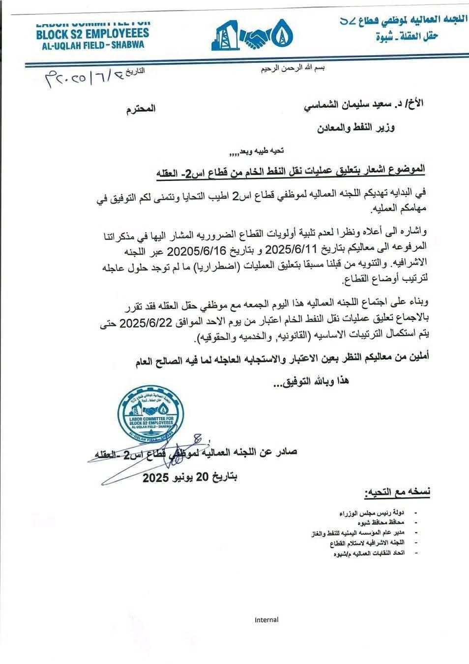 اعلن موظفو العقلة بشبوة وقف ضخ النفط الخام لكهرباء العاصمة عدن