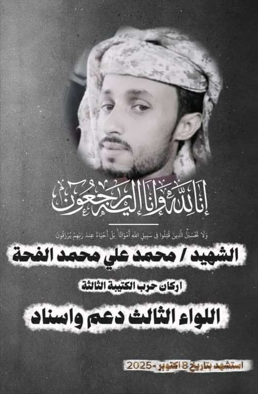 نعت القوات الجنوبية استشهاد البطل محمد علي محمد الفُحّة، أركان الكتيبة الثالثة في اللواء الثالث دعم وإسناد، الذي ارتقى شهيدًا صباح اليوم إثر انفجار عبوة ناسفة استهدفت دورية عسكرية في مديرية مودية بمحافظة أبين.