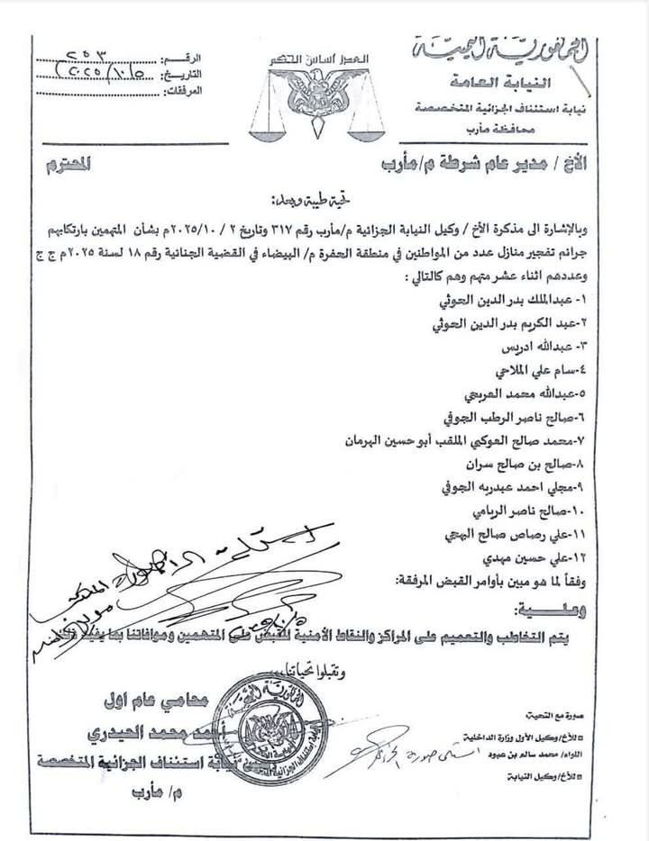 تداولت مصادر إعلامية وثيقة صادرة عن النيابة الجزائية المتخصصة في مأرب، تقضي بإصدار تعميم رسمي للقبض على زعيم مليشيا الحوثي وعدد من قيادات الجماعة على خلفية واقعة تفجير منازل وقتل عدد من أبناء حارة الحفرة في مدينة رداع