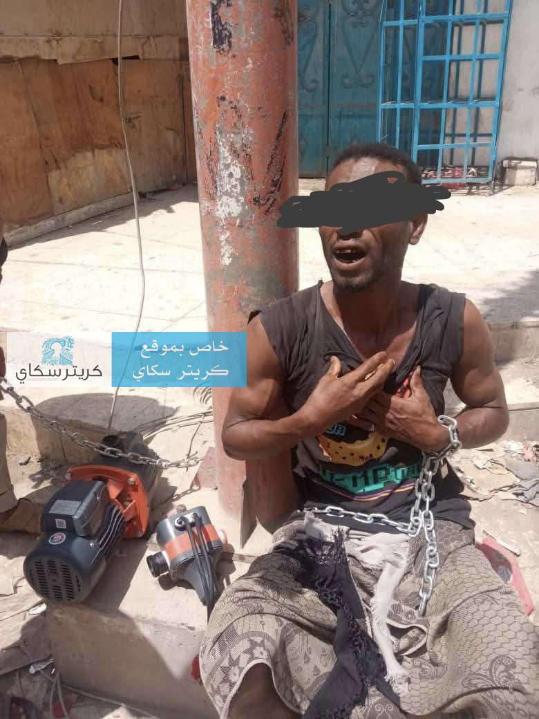 افاد مواطنون لكريتر سكاي بان مواطنون قاموا بالقبض على شخص قام بسرقة مضخات المياه بحي السنافر بالشيخ عثمان.