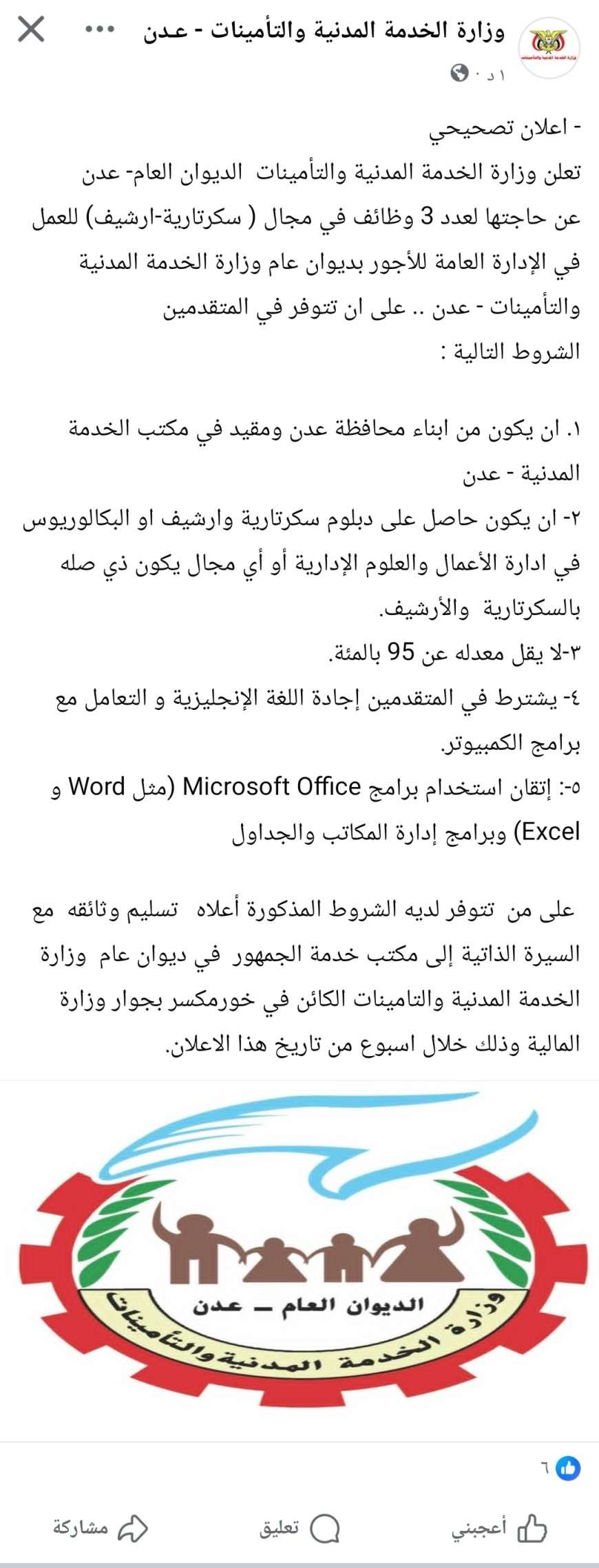 تعلن وزارة الخدمة المدنية والتأمينات الديوان العام- عدن