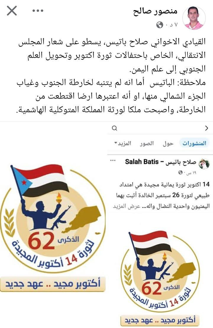 قال القيادي منصور صالح:القيادي الاخواني صلاح باتيس، يسطو على شعار المجلس الانتقالي، الخاص باحتفالات ثورة اكتوبر وتحويل العلم الجنوبي إلى علم اليمن.