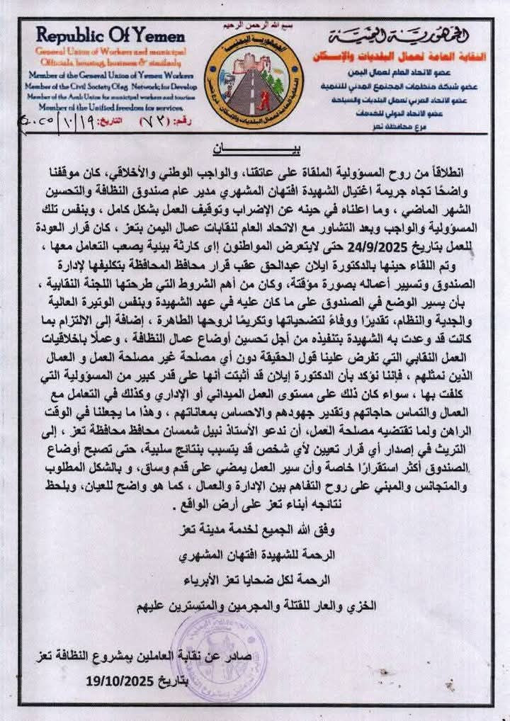أصدرت نقابة العاملين في مشروع النظافة بمحافظة تعز بيان اليوم بشأن جريمة إغتيال الشهيدة افتهان المشهري