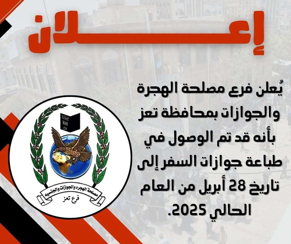 بعد فترة توقف مؤقتة بسبب أزمة الدفاتر، أعلنت مصلحة الجوازات بمحافظة تعز استئناف طباعة جوازات السفر للمواطنين، مؤكدة أن العمل عاد بوتيرة عالية، وأن الطباعة وصلت حاليًا إلى معاملات المواطنين حتى نهاية شهر أبريل 2025م.