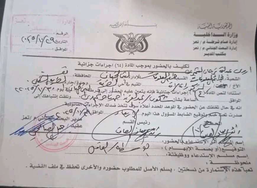 توجهت صباح اليوم الخميس 30 اكتوبر 2025 في الساعة 9 صباحا الى البحث الجنائي تنفيذا لطلب الحضور في الشكوى التي قدمها ضدي اركان حرب محور تعز العميد عبدالعزيز المجيدي على خلفية نشري لاتهام ام الشهيد شهاب الدعيس لاولاده بقتل ولدها واتهامها له بالتستر على اولاده وتهريبهم الى مصر.
