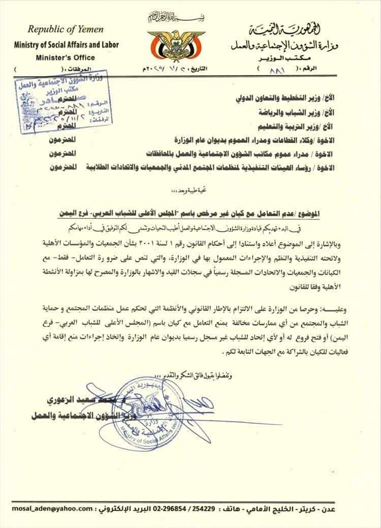 أصدرت وزارة الشؤون الاجتماعية والعمل تعميما رسميا، يحظر التعامل مع كيان غير مرخص يُعرف باسم "المجلس الأعلى للشباب العربي فرع اليمن".