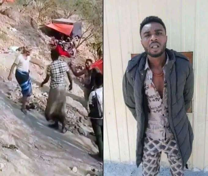 اعتقلت السلطات في اليمن مهاجر إفريقي بعد اعتدائه مع اصدقائه على مواطن يمني .
