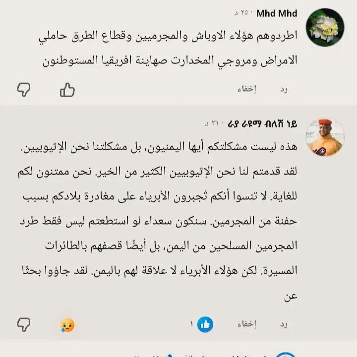 حيث قال في رسالته " هذه ليست مشكلتكم أيها اليمنيون، بل مشكلتنا نحن الإثيوبيين. لقد قدمتم لنا نحن الإثيوبيين الكثير من الخي ، نحن ممتنون لكم للغاية" .