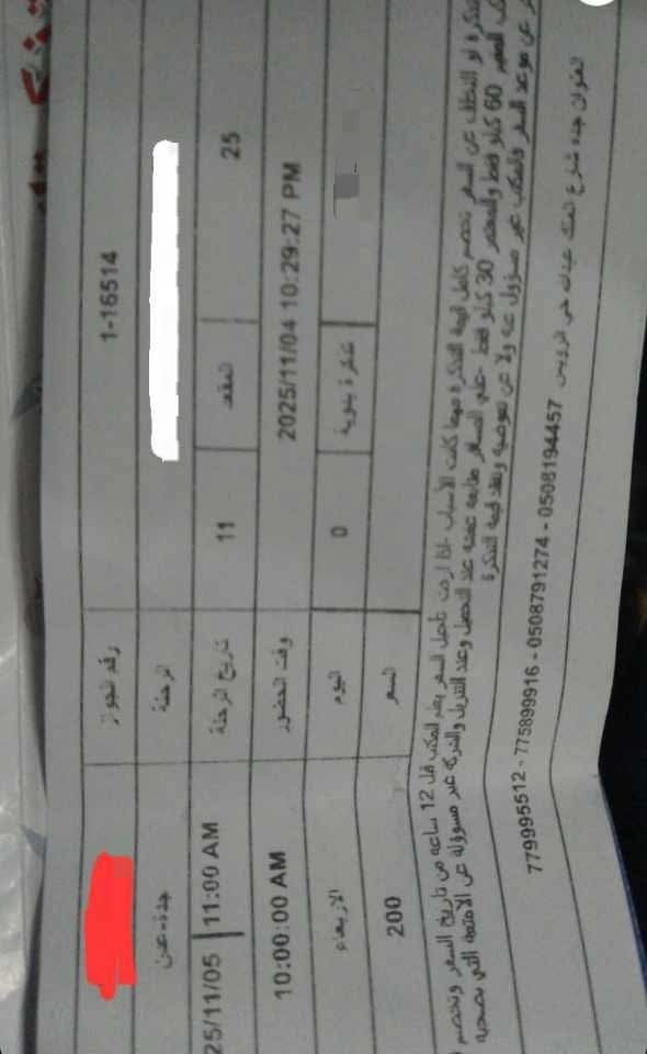 واضاف:وبهذا الخصوص، اتواصل معي أحد الأشخاص ليخبرني أن أقرباه في إحدى الرحلات العائدة إلى عدن من المملكة العربية السعودية، عبر شركة "نجمة السفير للنقل البري الدولي"، كما هو موضح في التذكرة بالصورة أدناه، وللأسف تعرضوا في رحلتهم هذه التي لا زالوا فيها إلى وقت كتابة المنشور، لمعاناة مضاعفة نتيجة: