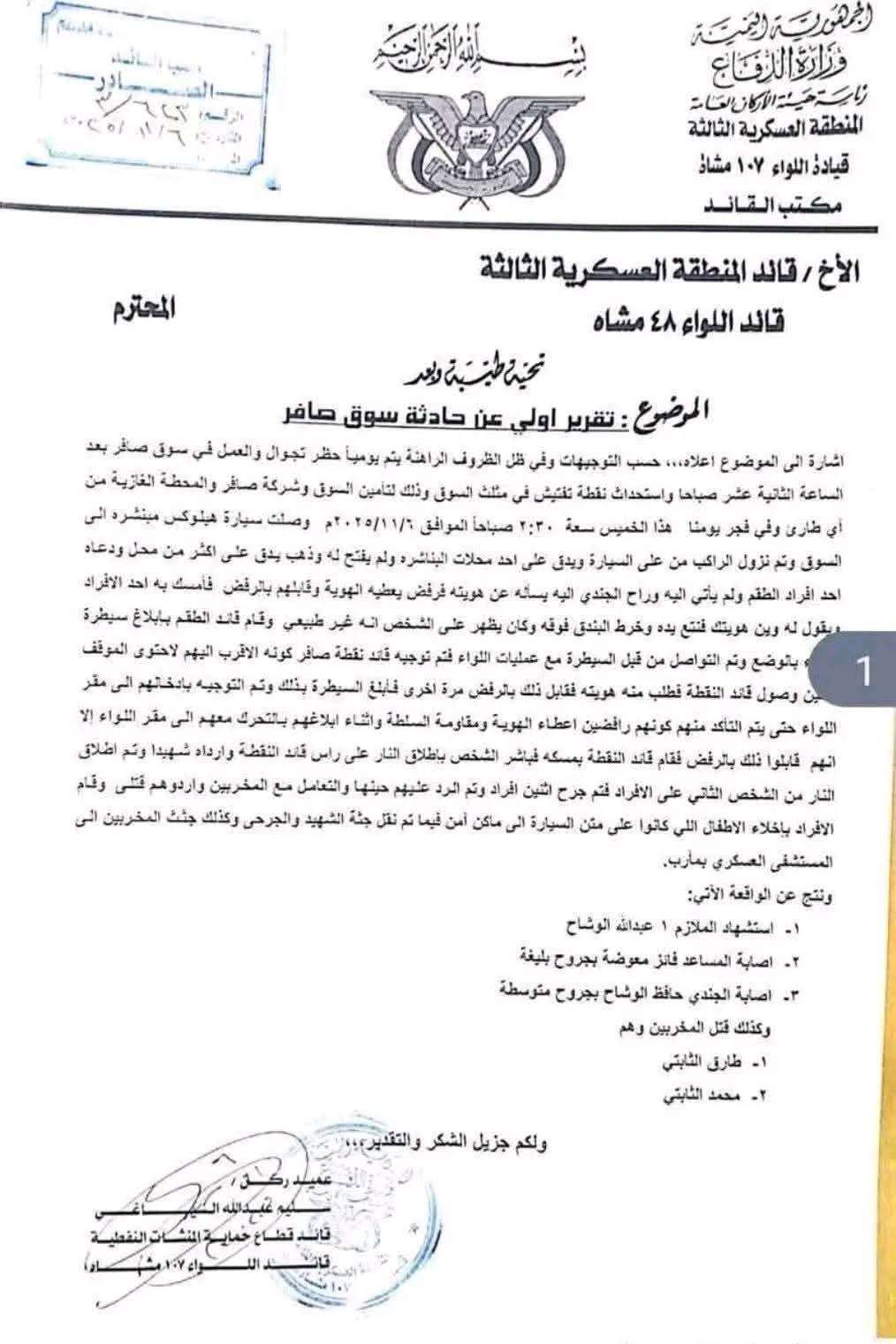 كشفت مذكرة عسكرية رسمية صادرة عن قيادة اللواء ١٠٧ مشاة بمكتب القائد، عن تفاصيل واقعة اشتباك مسلح مؤسفة وقعت فجر أمس الخميس في سوق صافر بمحافظة مأرب، أسفرت عن سقوط قتيل وجريحين في صفوف القوات الأمنية.