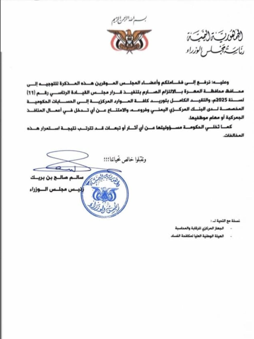 بعث رئيس الوزراء سالم بن بريك ببرقية الى رئيس مجلس القيادة الرئاسي واعضاء المجلس يشكوى فيها من تدخل محافظ المهرة بعمل المنافذ الجمركية ورفضه توريد الايرادات الى البنك المركزي.