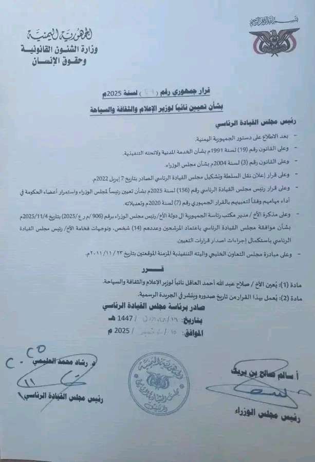 صدر قرار جمهوري بتعيين نائب اول لوزير الإعلام والثقافة والسياحة في الحكومة الشرعية.